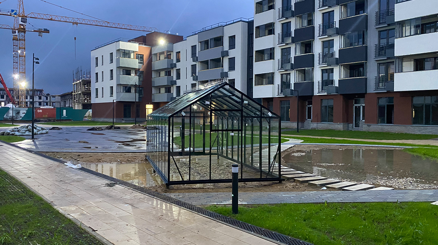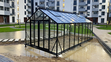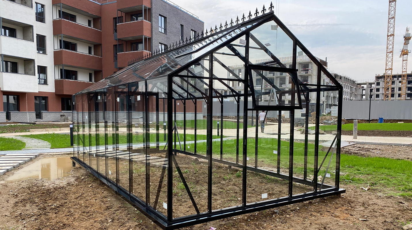 Решение, адаптированное для городской среды и жилой застройки. Теплица органично интегрируется в пространство ЖК, сохраняя аккуратную архитектуру и создавая функциональное место для выращивания в условиях города.