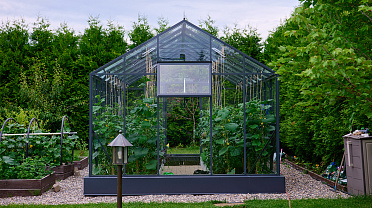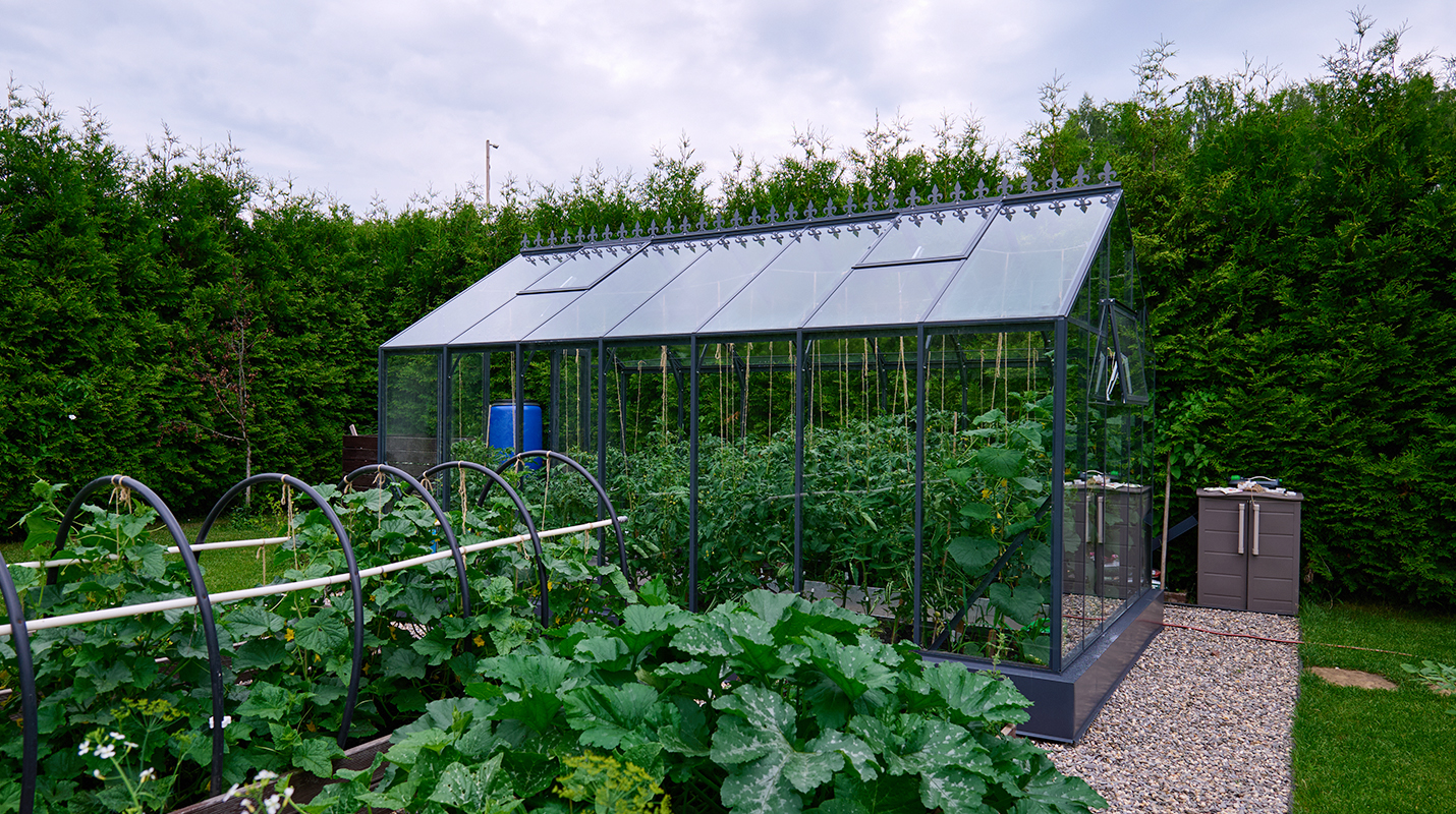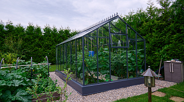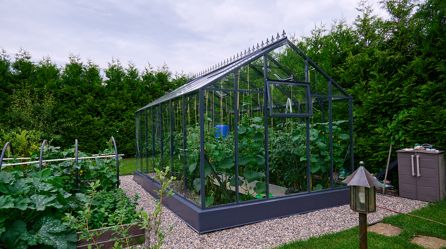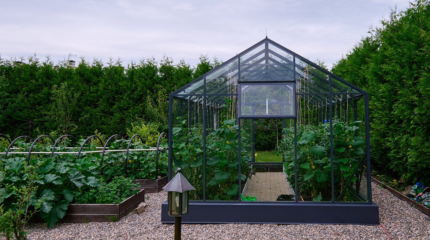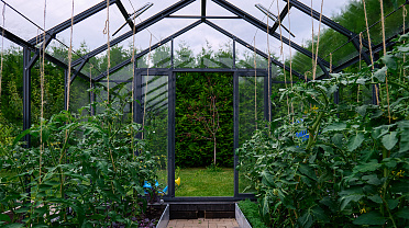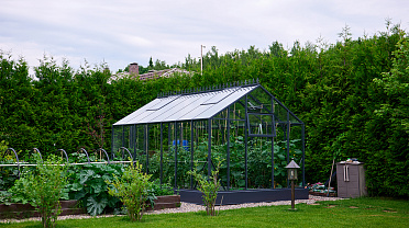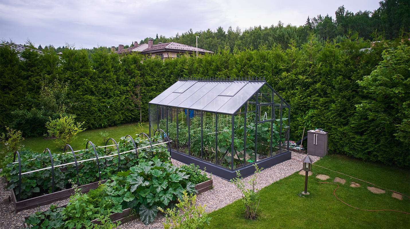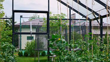 Чёткая геометрия подчёркивает строгий и собранный характер конструкции. Теплица формирует выразительный акцент на участке, сочетая архитектурную сдержанность с ощущением надёжности и продуманного пространства.