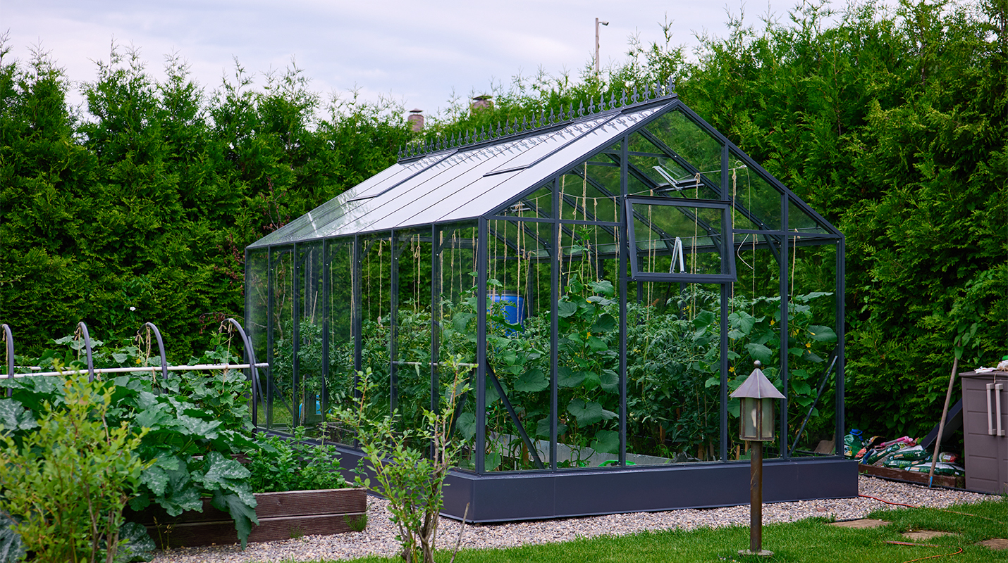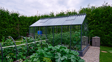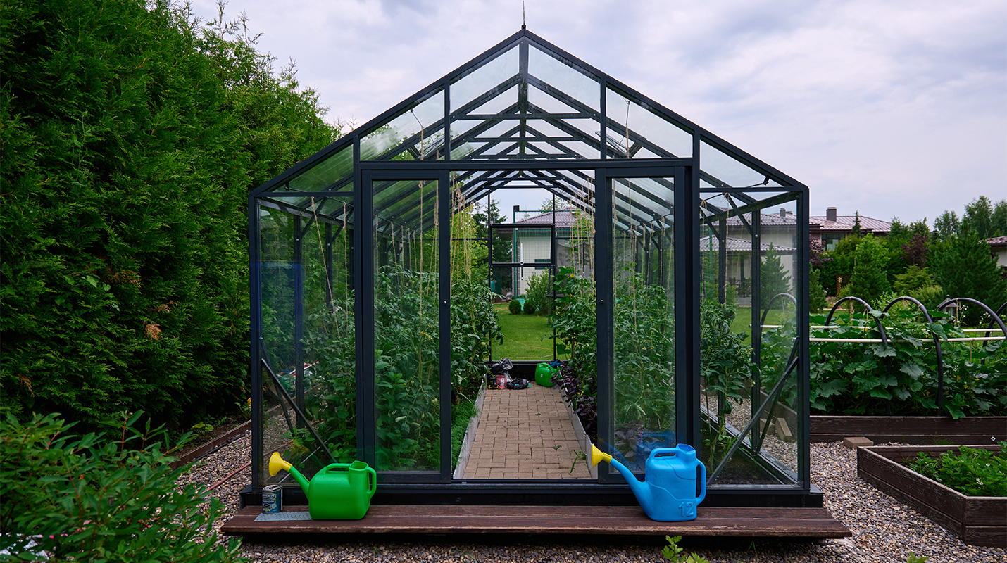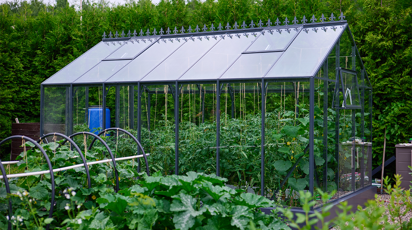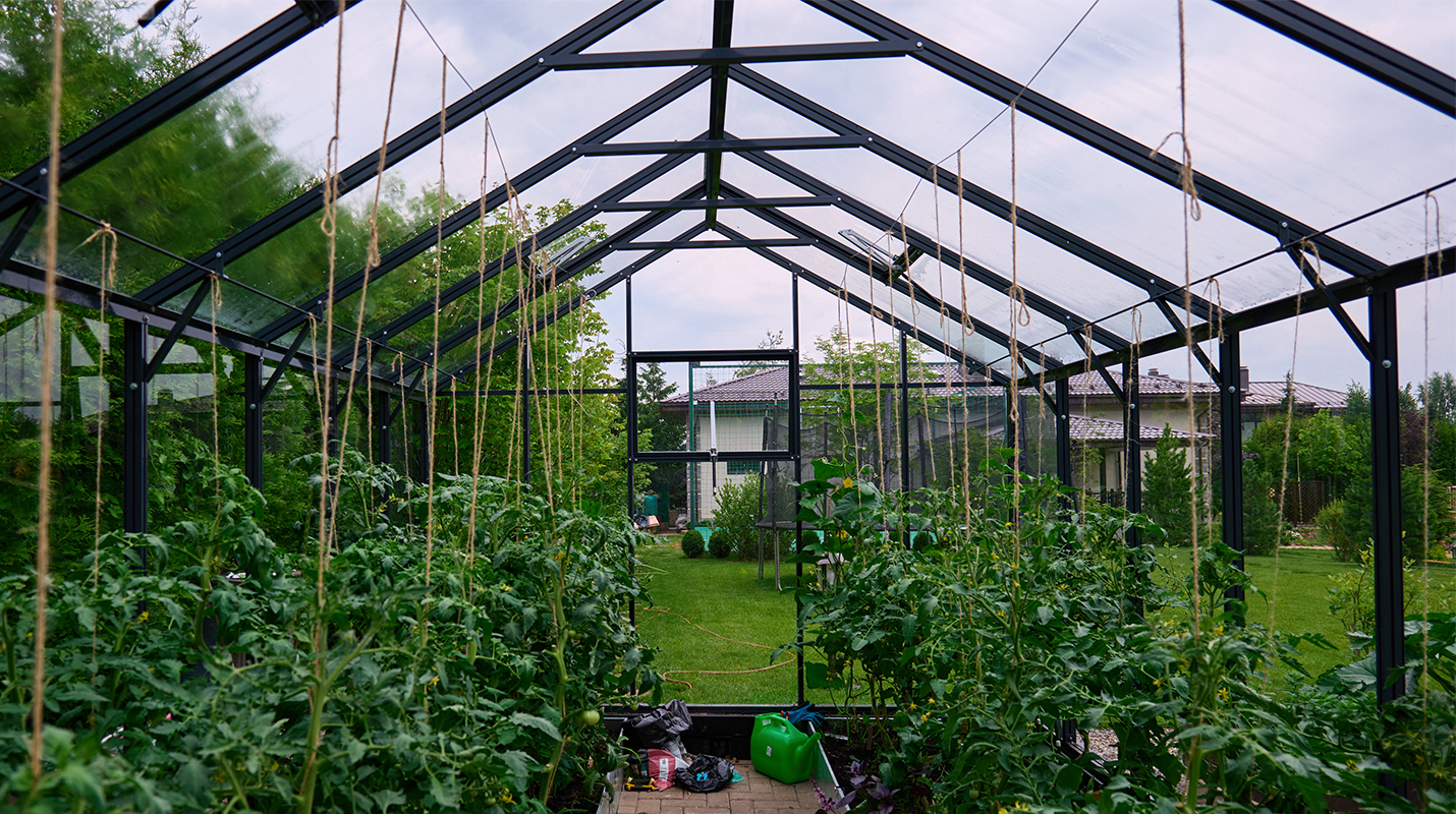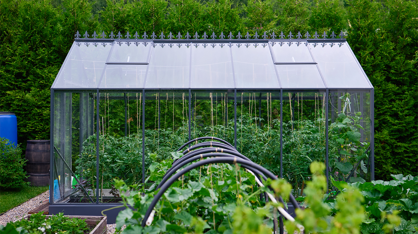 Чёткая геометрия подчёркивает строгий и собранный характер конструкции. Теплица формирует выразительный акцент на участке, сочетая архитектурную сдержанность с ощущением надёжности и продуманного пространства.