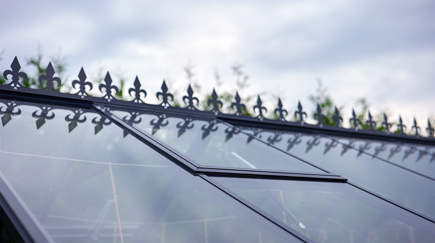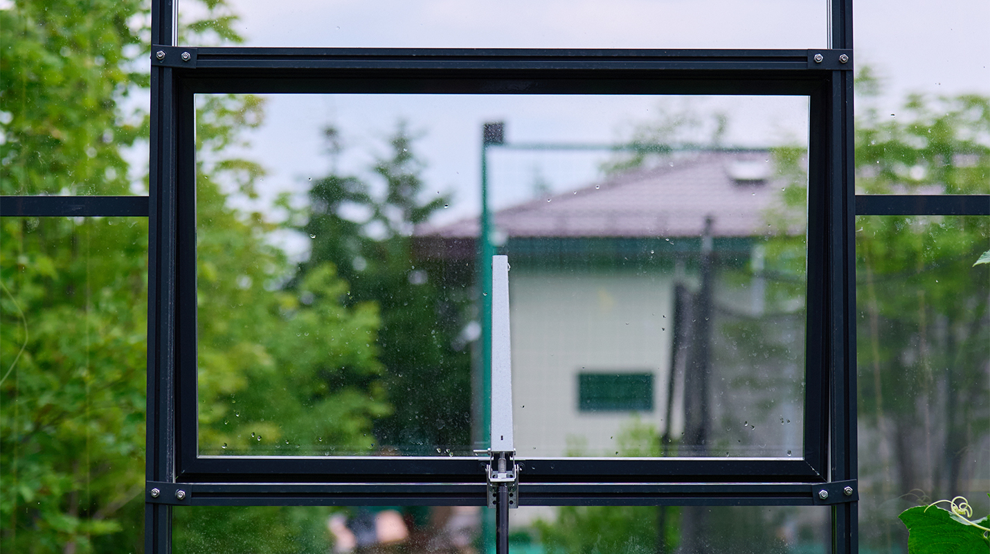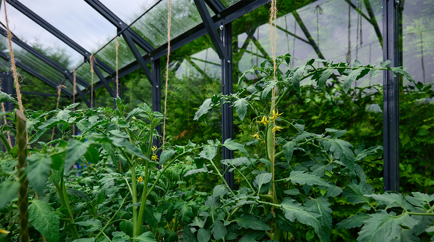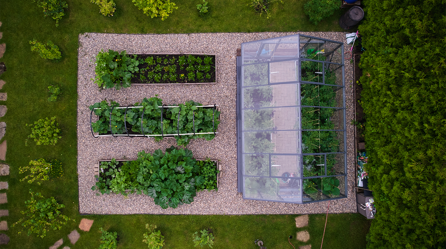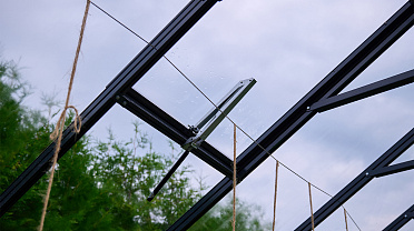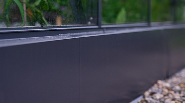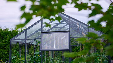 Чёткая геометрия подчёркивает строгий и собранный характер конструкции. Теплица формирует выразительный акцент на участке, сочетая архитектурную сдержанность с ощущением надёжности и продуманного пространства.