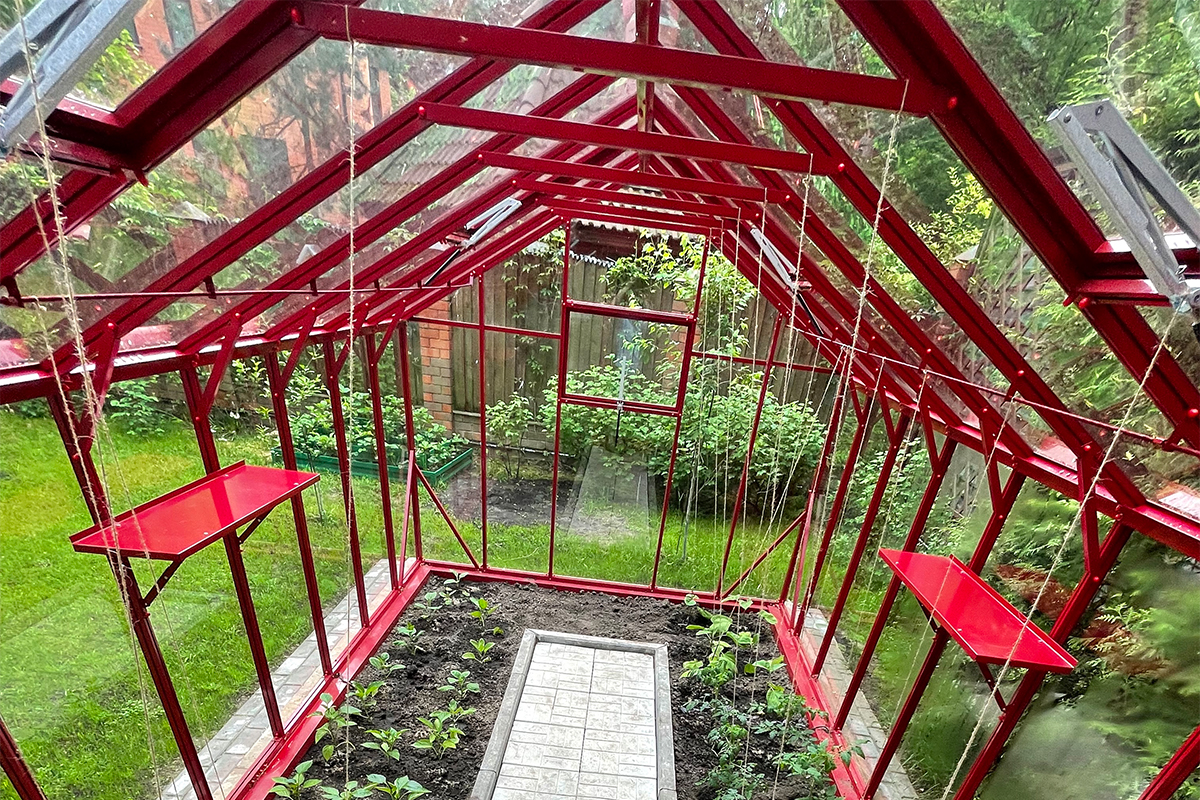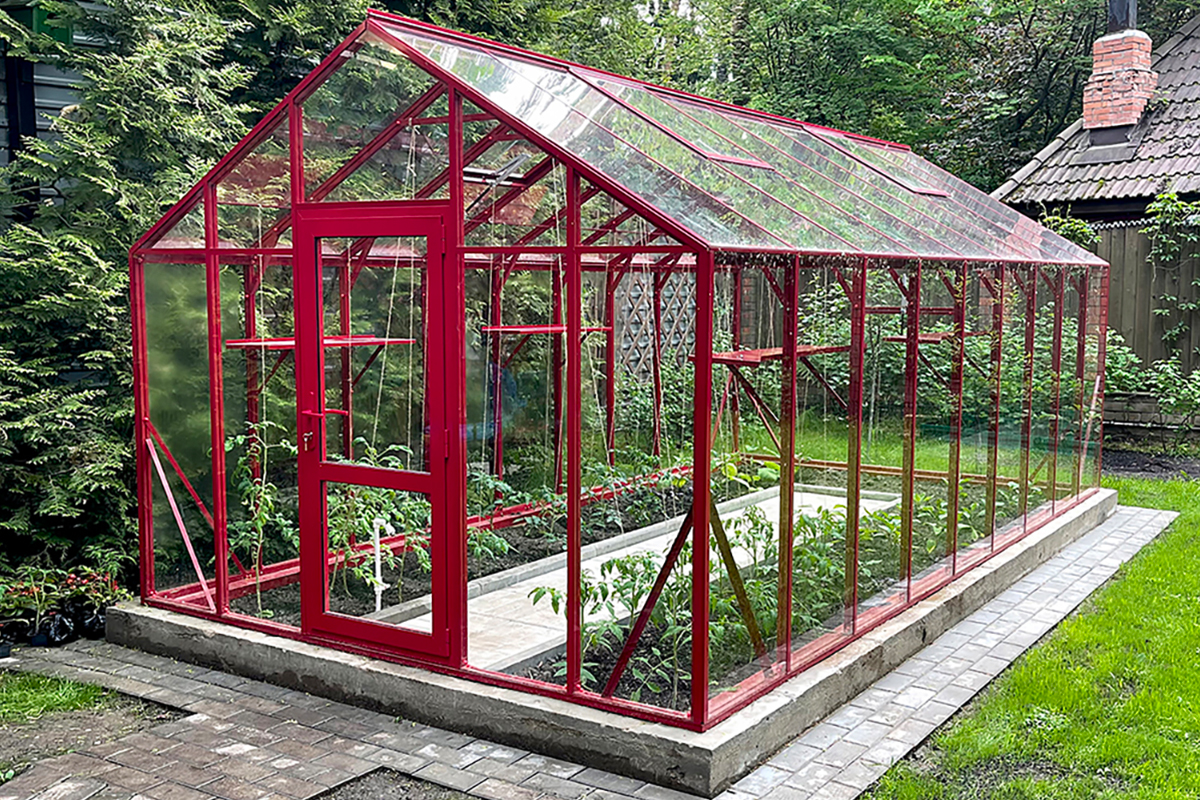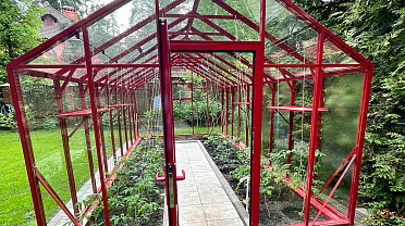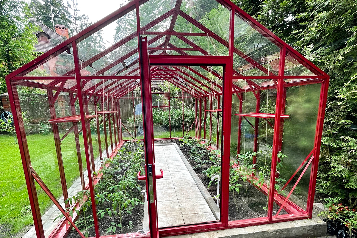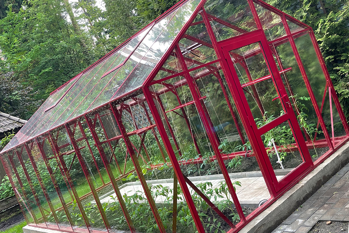 Теплица БИОНИКА Классик – яркая архитектурная доминанта участка, проект для ведущей телевидения Первого канала. Насыщенный цвет задаёт характер пространства, подчёркивая геометрию и делая теплицу выразительным акцентом в окружении.