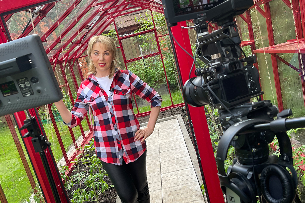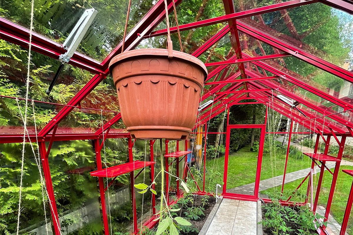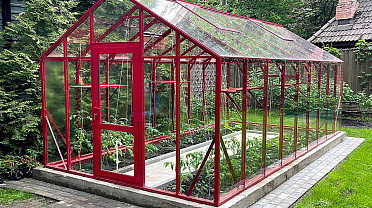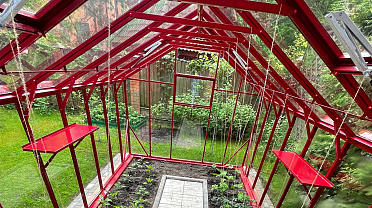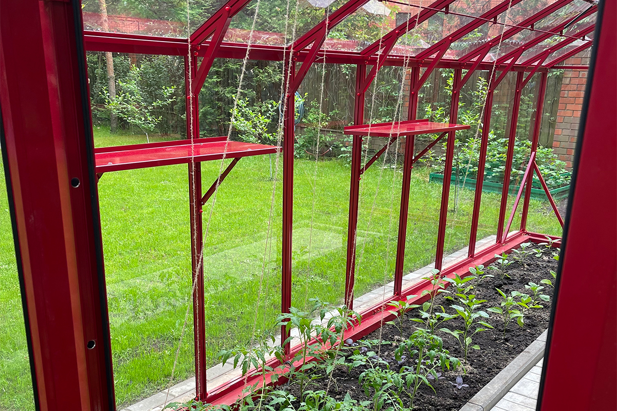 Теплица БИОНИКА Классик – яркая архитектурная доминанта участка, проект для ведущей телевидения Первого канала. Насыщенный цвет задаёт характер пространства, подчёркивая геометрию и делая теплицу выразительным акцентом в окружении.