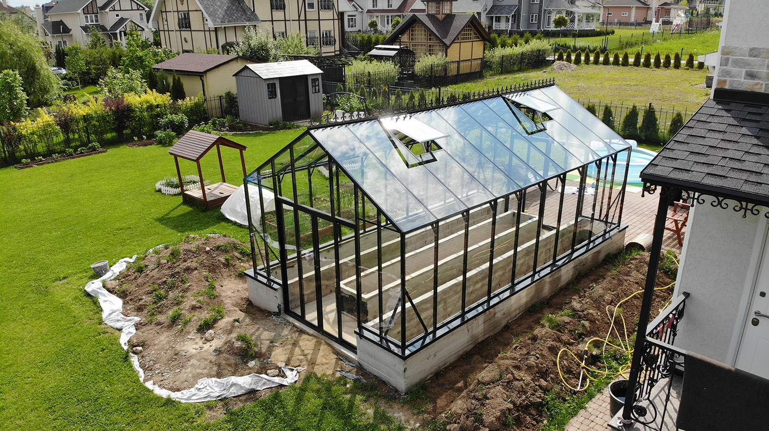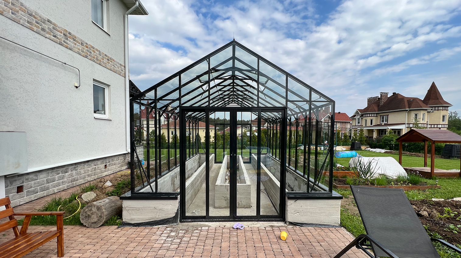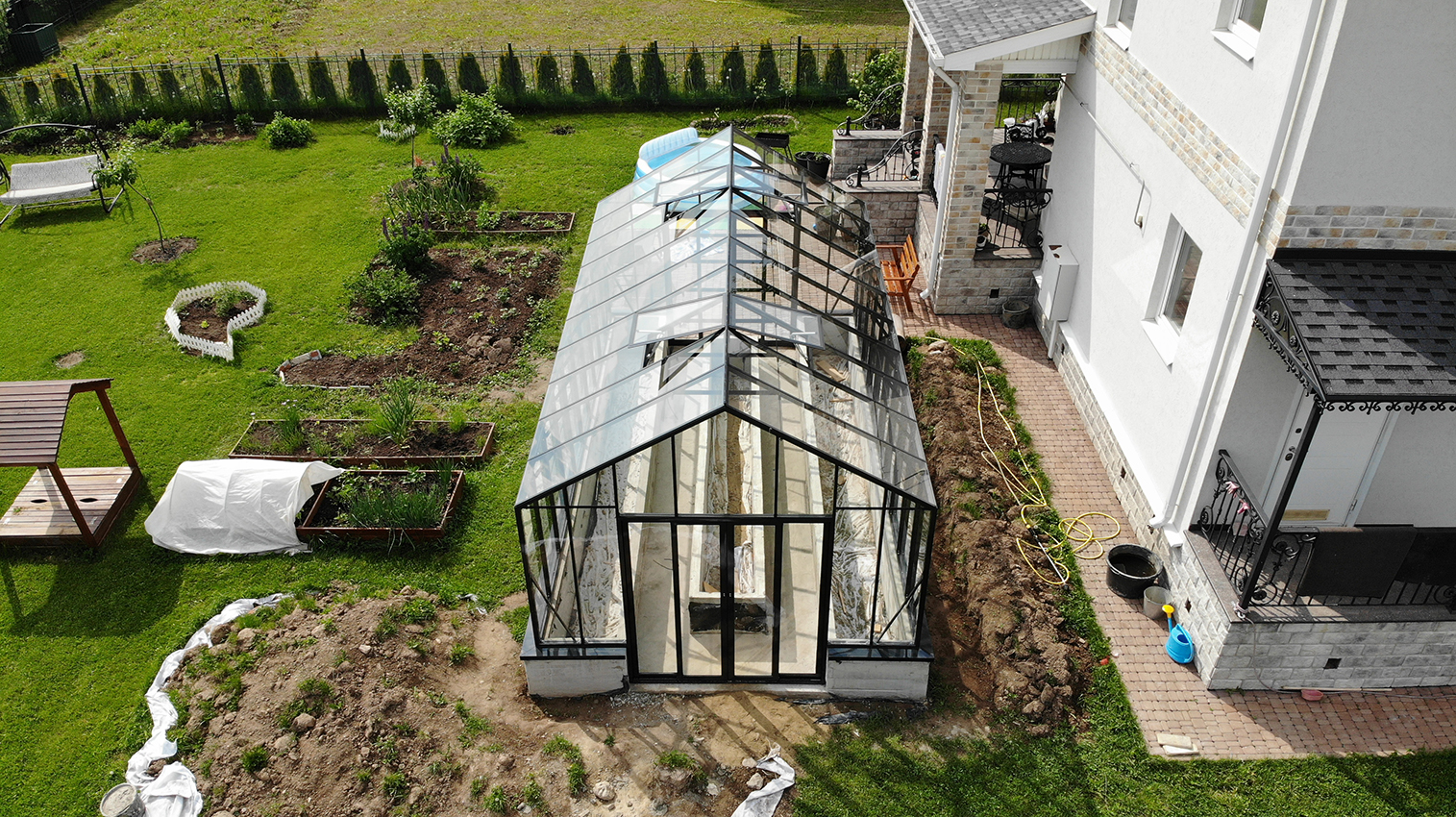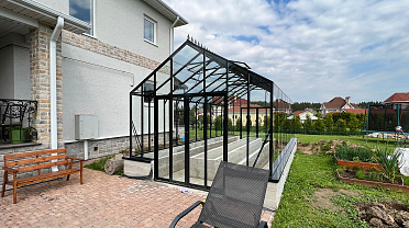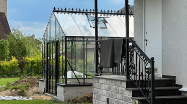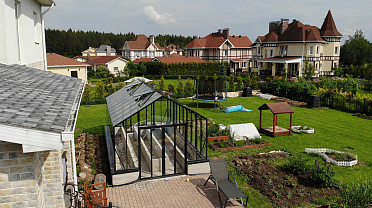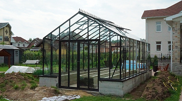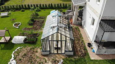 Решение с акцентом на удобство повседневной работы и продуманную организацию пространства. Высокий фундамент формирует комфортную высоту грядок, а заниженная дверь делает вход более естественным, создавая логичную и эргономичную среду внутри теплицы.