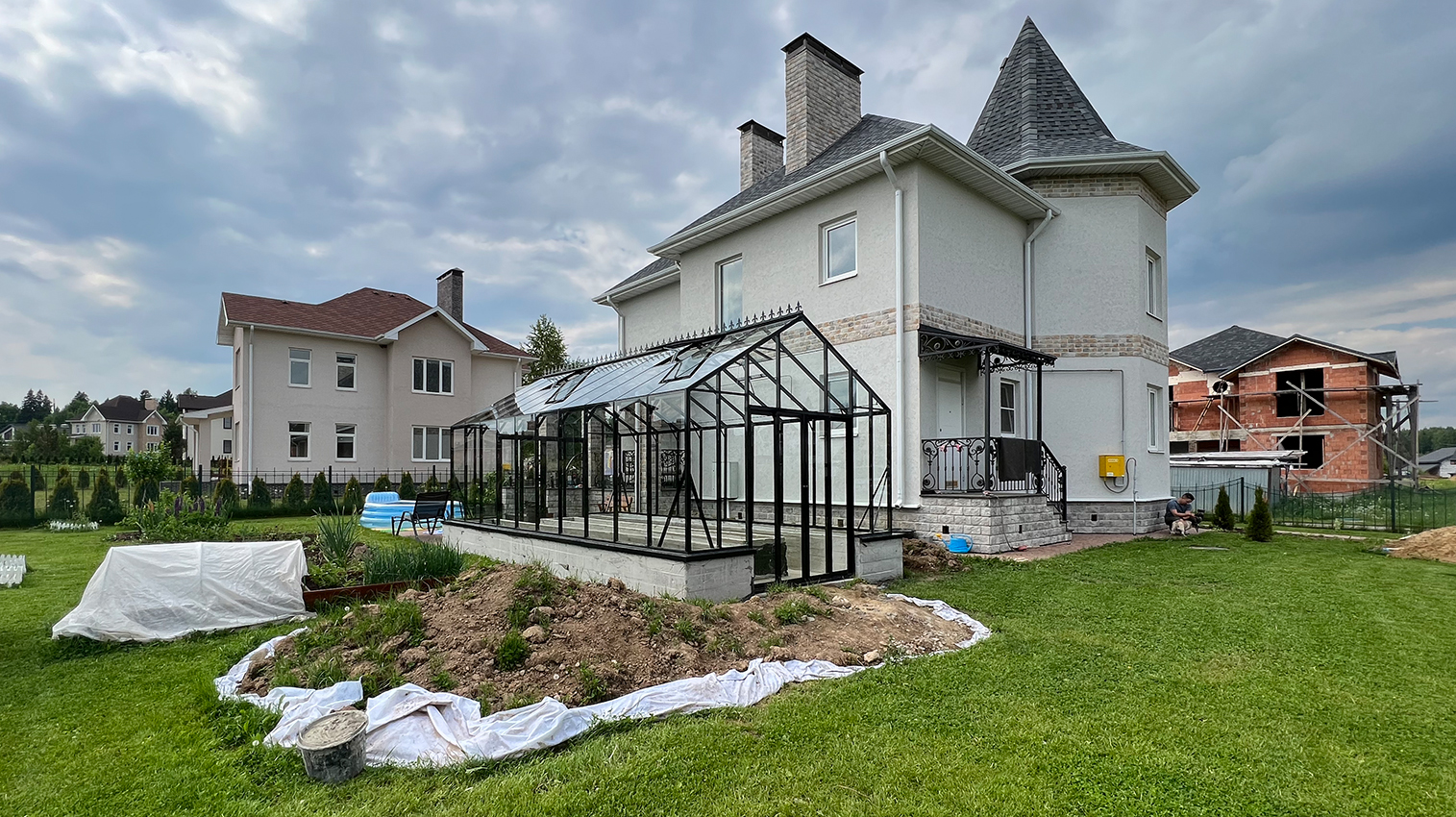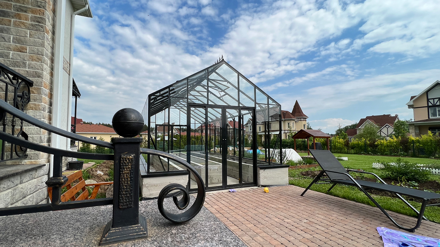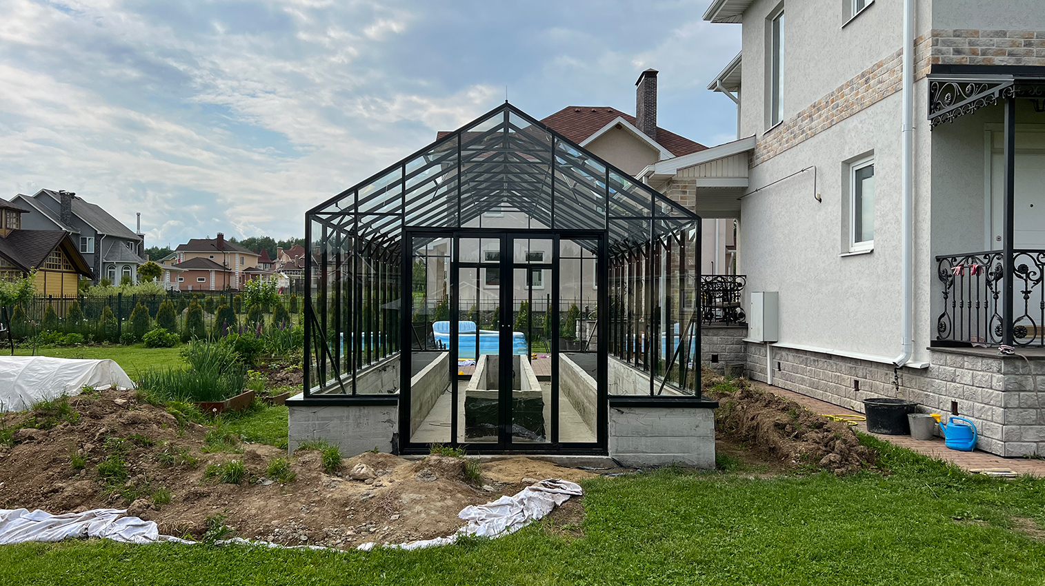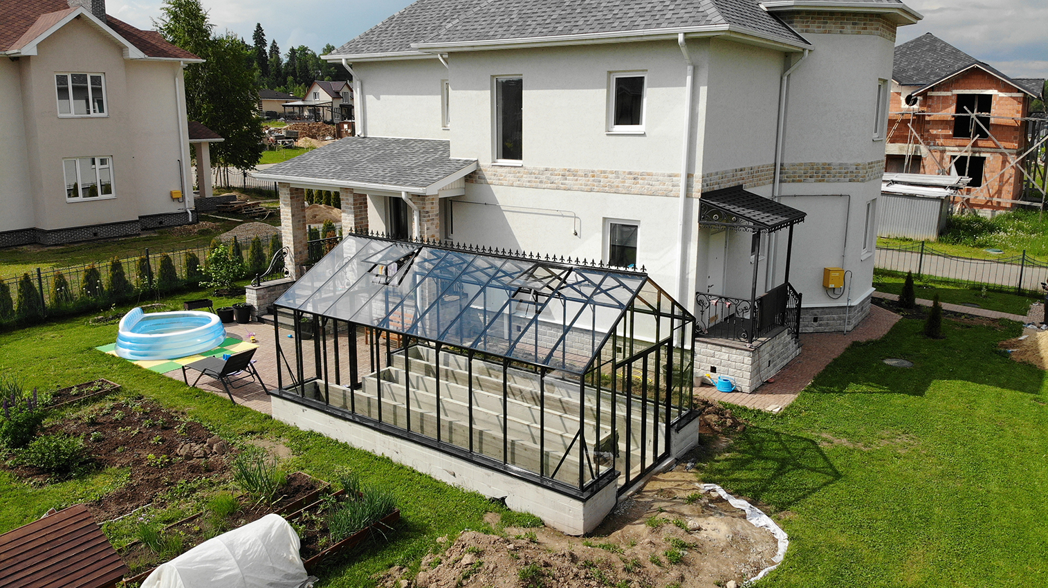 Решение с акцентом на удобство повседневной работы и продуманную организацию пространства. Высокий фундамент формирует комфортную высоту грядок, а заниженная дверь делает вход более естественным, создавая логичную и эргономичную среду внутри теплицы.